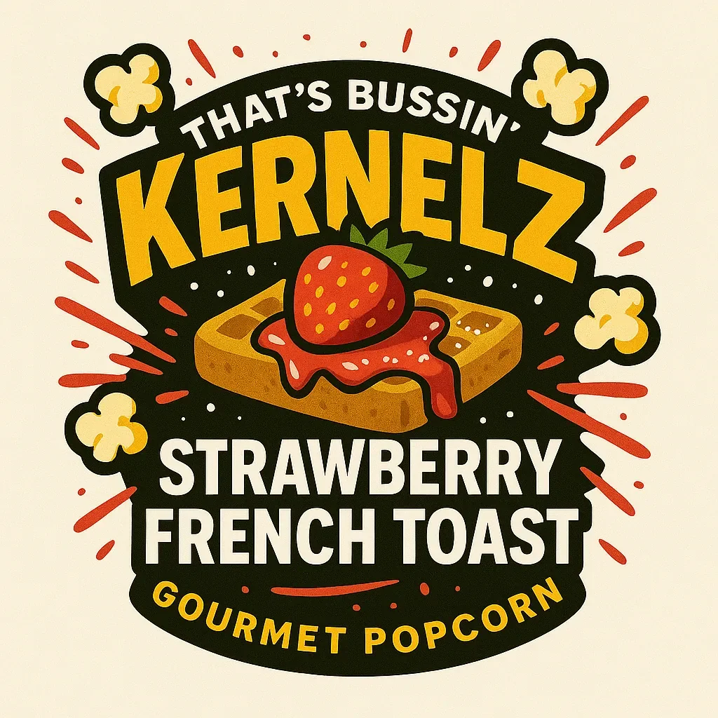 Each kernel carries a layered contrast: a warm, cinnamon-toast dusting that settles in soft and aromatic, paired with a glossy strawberry drizzle that brings a bright, candy-like shine. The powdered-sugar note floats through with a gentle sweetness, giving the finish a soft, dreamy touch that tastes like brunch dessert without ever needing a fork. The textures play off one another—warm and comforting, glossy and fruity, lightly sweet and full of charm.